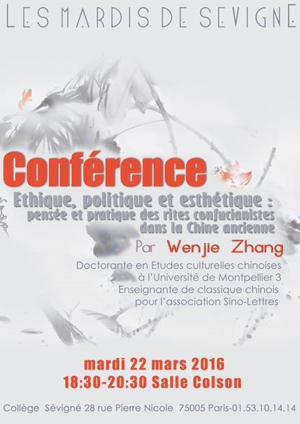 Melle Zhang doctorante en Etudes Chinoises à l’Université de Montpellier, a donné une conférence sur le thème "Les rites confucianistes dans la Chine ancienne". Melle Zhang anime notre atelier de culture chinoise du primaire le mercredi matin avec l’association Sino-Lettres.
