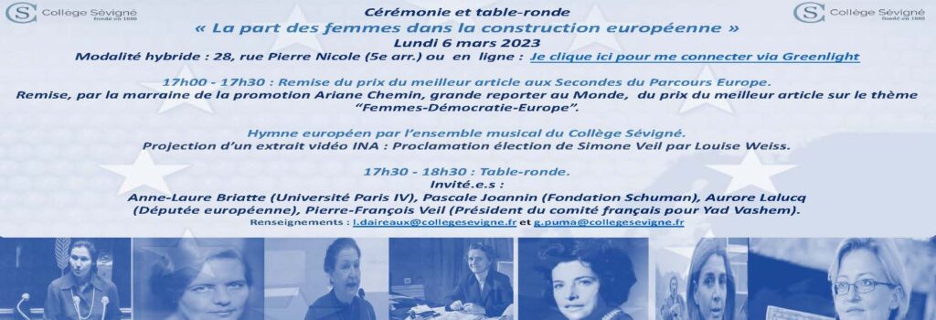 Le 6 mars 2023, table-ronde consacrée à la part des femmes dans la construction européenne, avec Anne-Laure Briatte (Université Paris IV), Pascale Joannin (Fondation Schuman) et Pierre-François Veil (Président du Comité français pour Yad Vashem).
