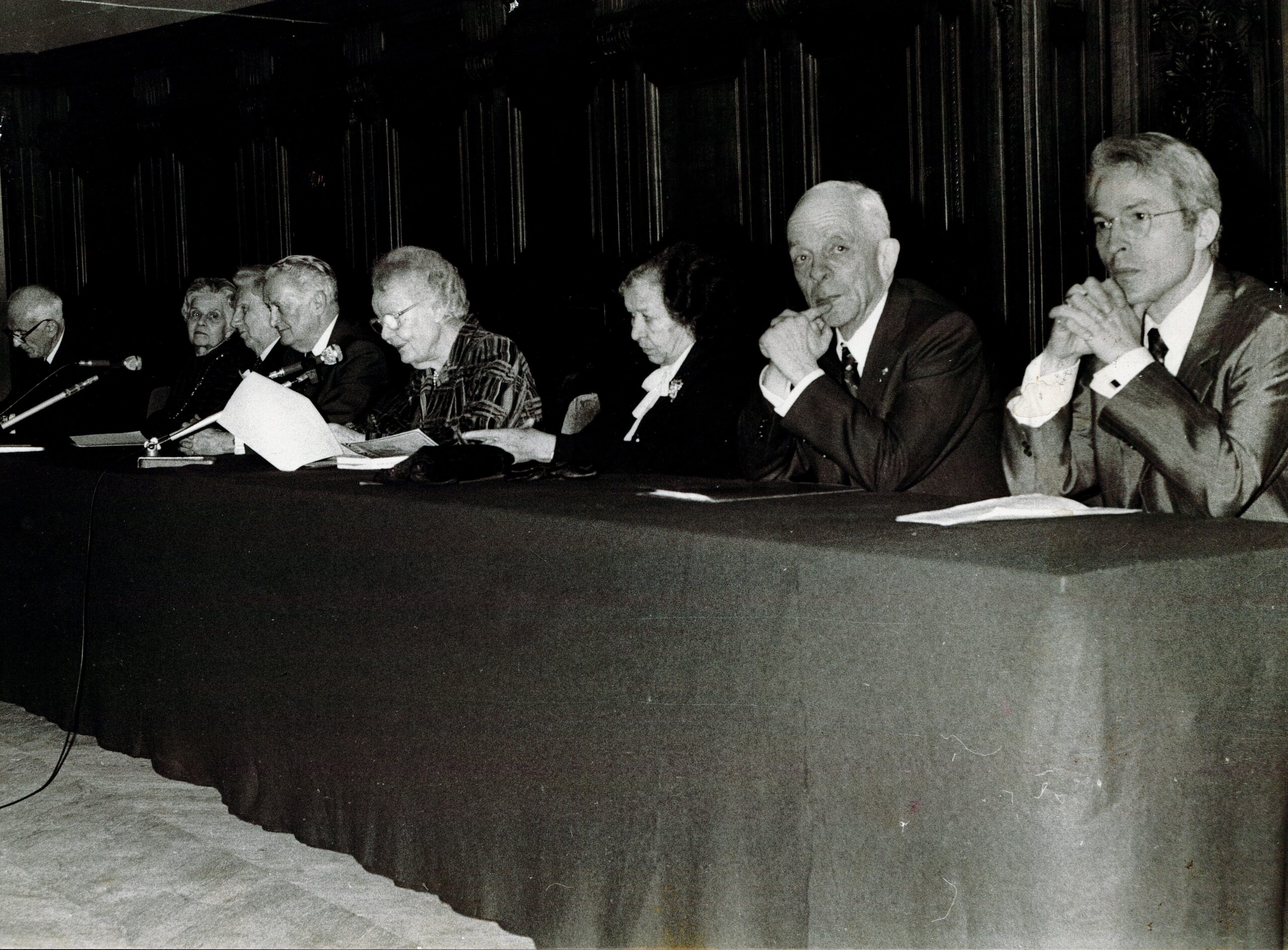 Photo de la célébration du Centenaire du Collège, le 27 novembre 1980, de gauche à droite : M. Olivier Wormser, Mme Jean Bernard, M. René Brouillet, M. Jacques Boudet, Mme Louise Weiss, Mme Jacqueline de Romilly, M. Jean Bernard et M. Gilbert Py.