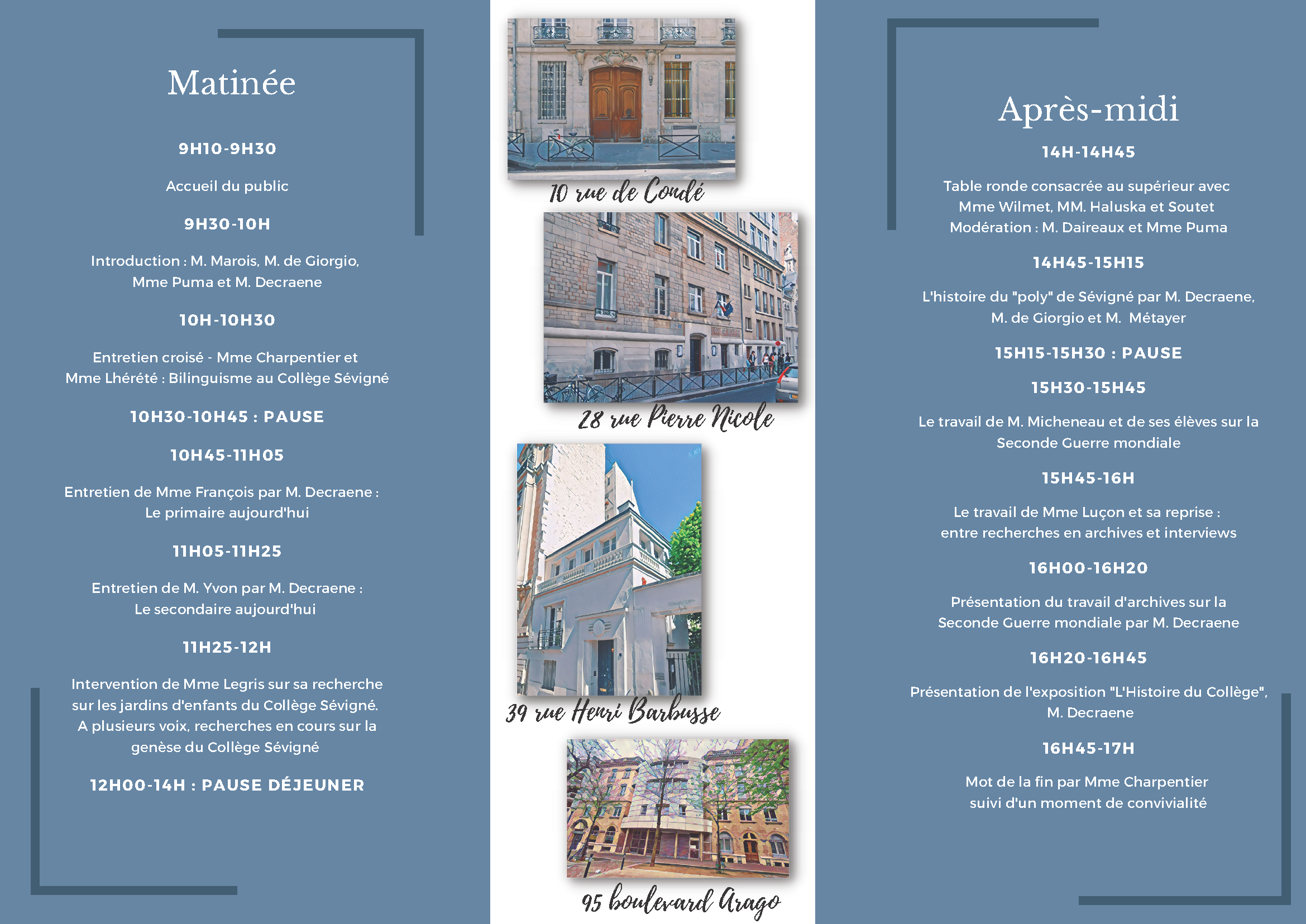 L'après-midi, nous avons évoqué tout d'abord l'histoire du département de l'enseignement supérieur avec ses acteurs. Ensuite, nous nous sommes consacrés à l'histoire du Collège Sévigné durant la Seconde Guerre mondiale : les adultes travaillant au Collège, les élèves y étant scolarisés et leurs familles durant ces années cruciales. Nous avons rendu hommage à celles et ceux qui ont été victimes de l'occupant et du régime de Vichy, à celles et ceux qui ont aidé et caché les Juifs. Autant de parcours patiemment reconstitués, y compris grâce aux précieux témoignages recueillis auprès des descendants et des témoins vivants qui ont généreusement répondu à nos questions.