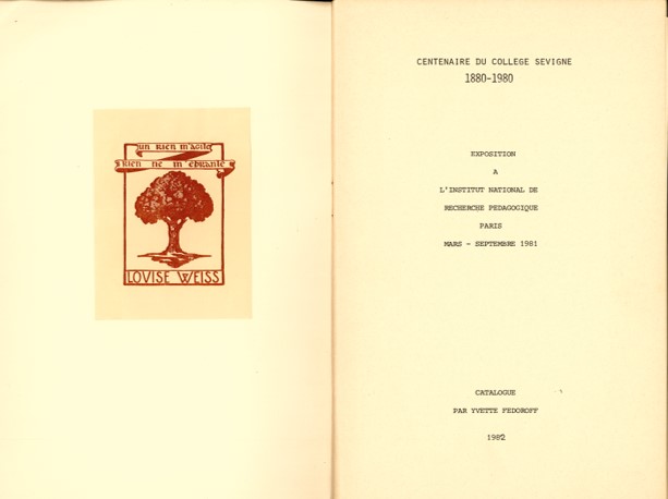 Première page du Catalogue de l'exposition du Centenaire, texte édité par Mme Yvette Fédoroff, conservatrice en chef du département de la Musique à la Bibliothèque Nationale de France et ancienne élève du Collège Sévigné ; exemplaire de Louise Weiss comportant son ex libris