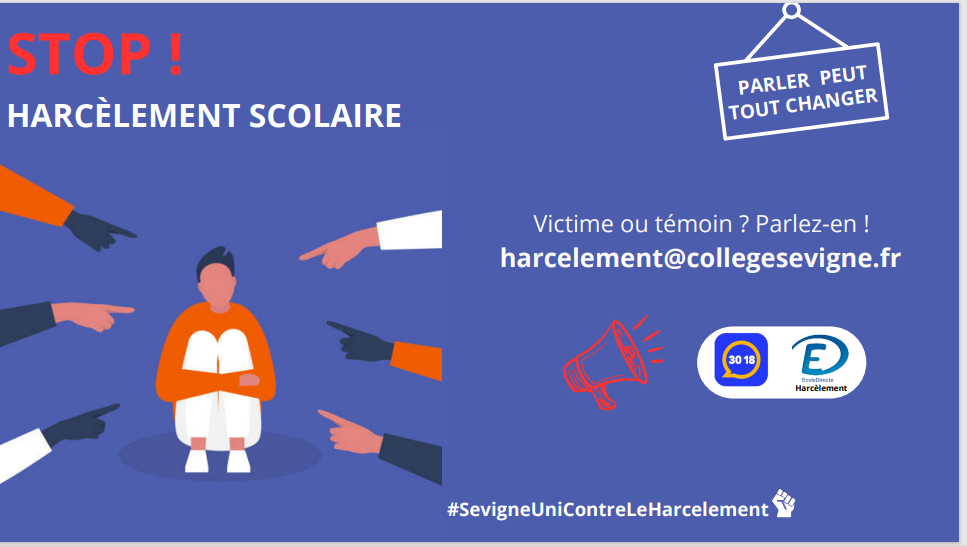 Vous souhaitez signaler un cas de harcèlement, vous pouvez également écrire à harcelement@collegesevigne.fr, via Outlook ou via Ecole Directe.